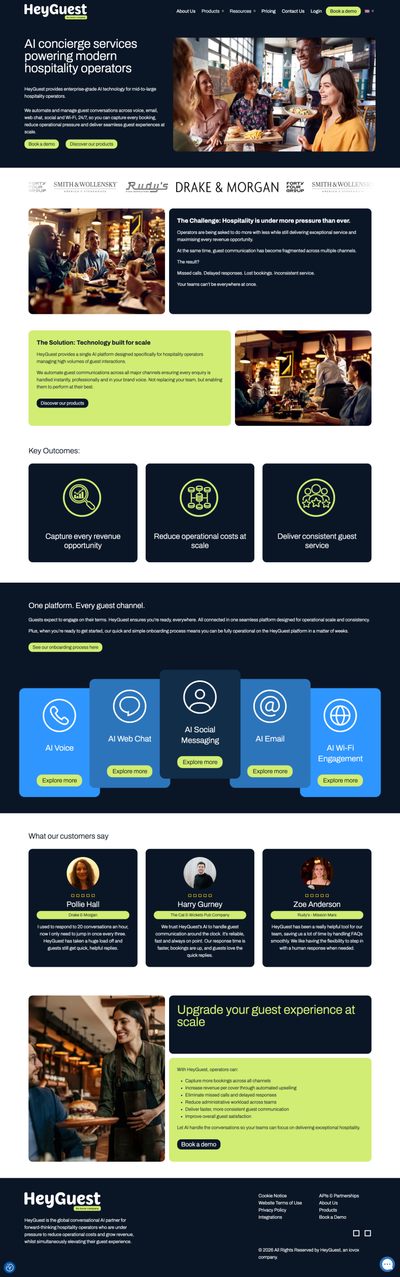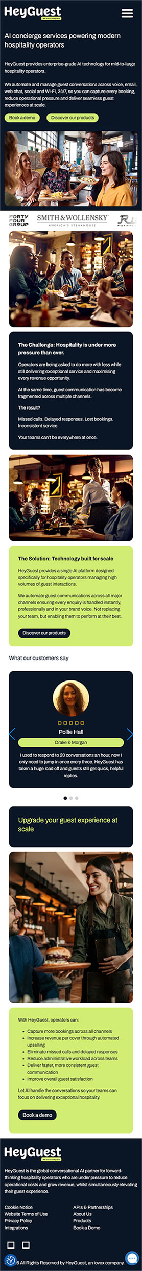 The site seamlessly identifies and localises for UK and US markets, and has been designed to effectively communicate the benefits of augmenting a hospitality team with AI technology to improve customer experiences.