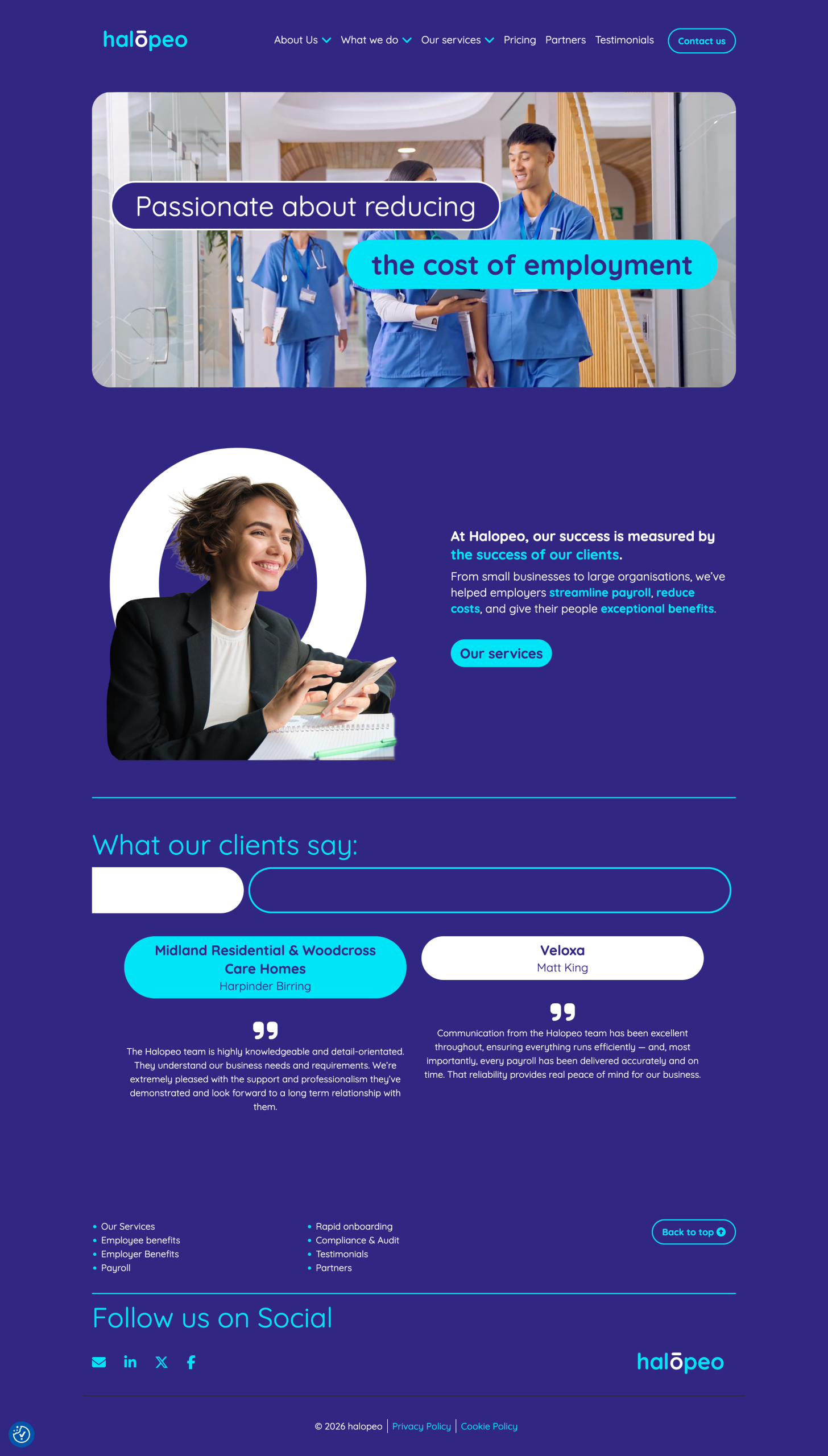+ PreviousAs a Professional Employer Organisation, Halopeo helps employers streamline payroll, reduce costs, and give their people exceptional benefits. They needed to communicate their offering more effectively – previous branding did not provide strong visual standout, and they wanted a clean modern look and feel that could carry the business forward and represent their distinctive offering.